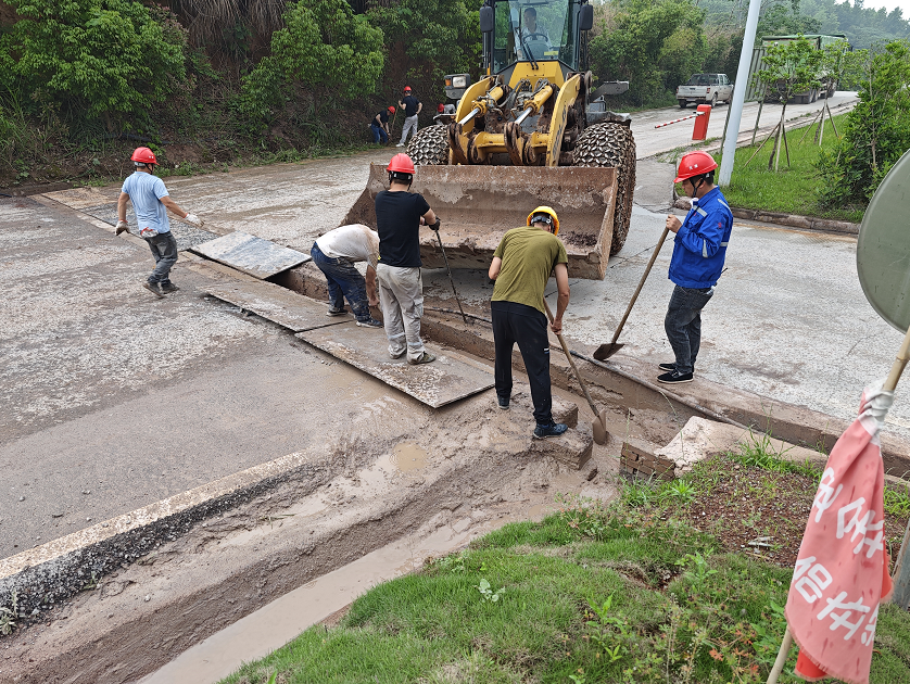 二是針對(duì)110平臺(tái)入口處水溝的清理,由于堵塞塊石較多,管理人員有效分工,先用薅鋤將底部松動(dòng),再用鐵鍬清理堵塞物,最后安排鏟車修整被沖毀路面。