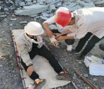 利用擔架將傷員送到安全區(qū)